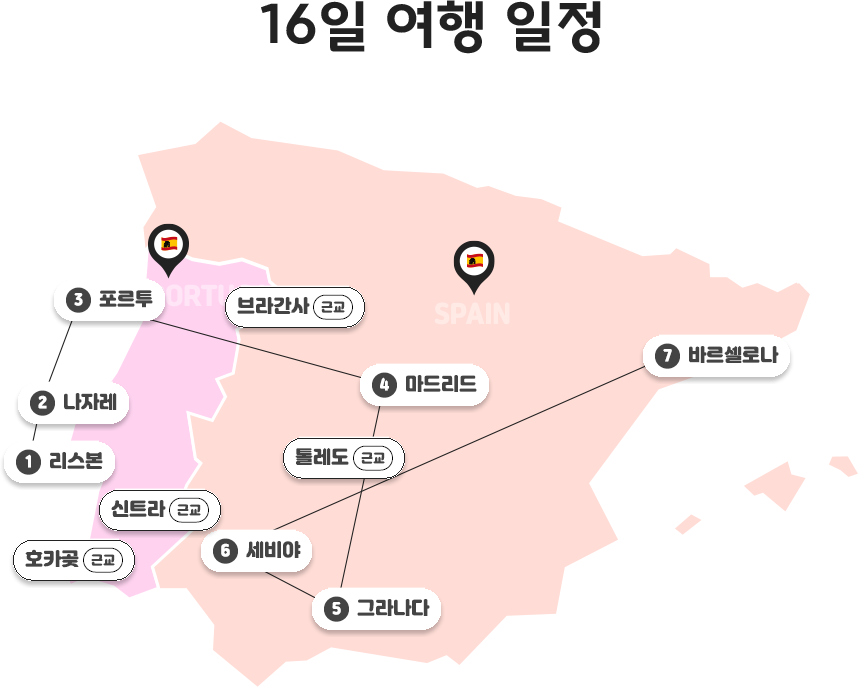 리스본(3박) > 나자레(1박) > 포르투(3박) > 마드리드(2박) >